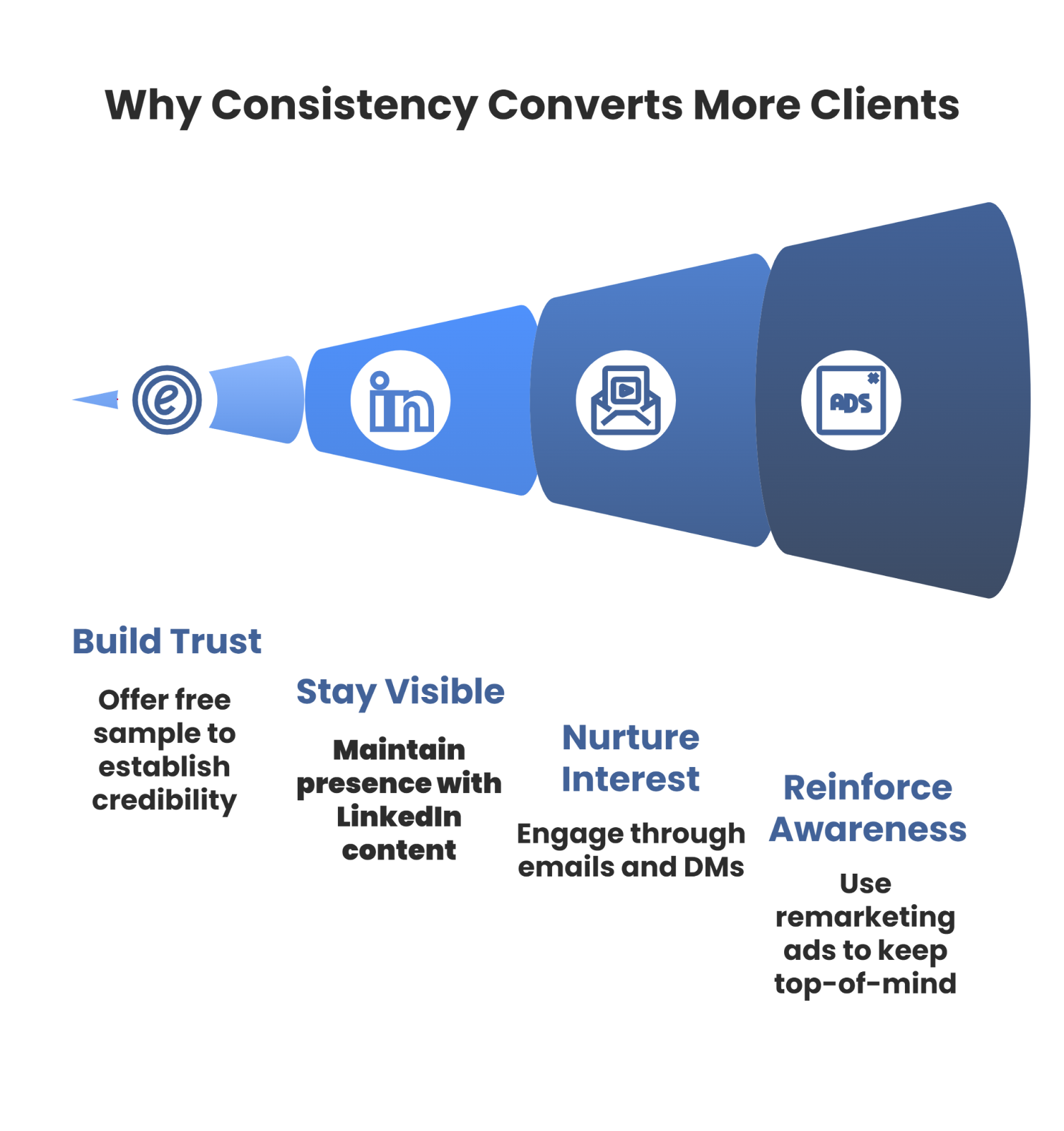 If you aim to sell to completely cold companies that don't know, like, or trust you yet, they’re not going to buy immediately. You need to consistently appear in front of them across multiple channels until they’re ready to purchase.